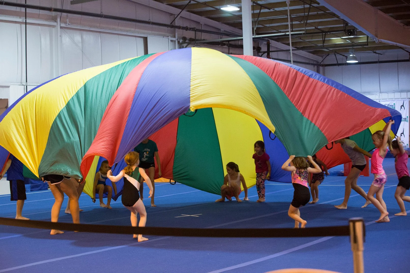 Age-appropriate games and obstacle courses, Parachute play and inflatable landing fun